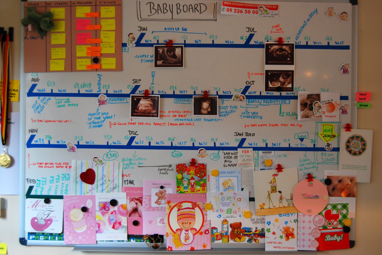 In Belgium, people exchange cards when a baby is born. As cards started to arrive, we put them on the taskboard, turning it into a “celebration” board.