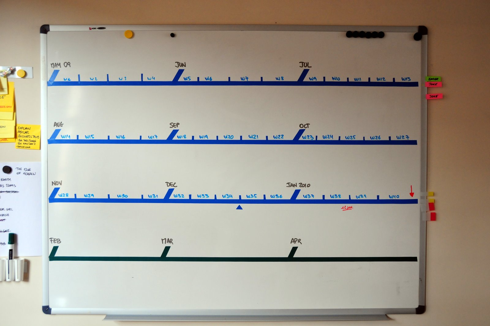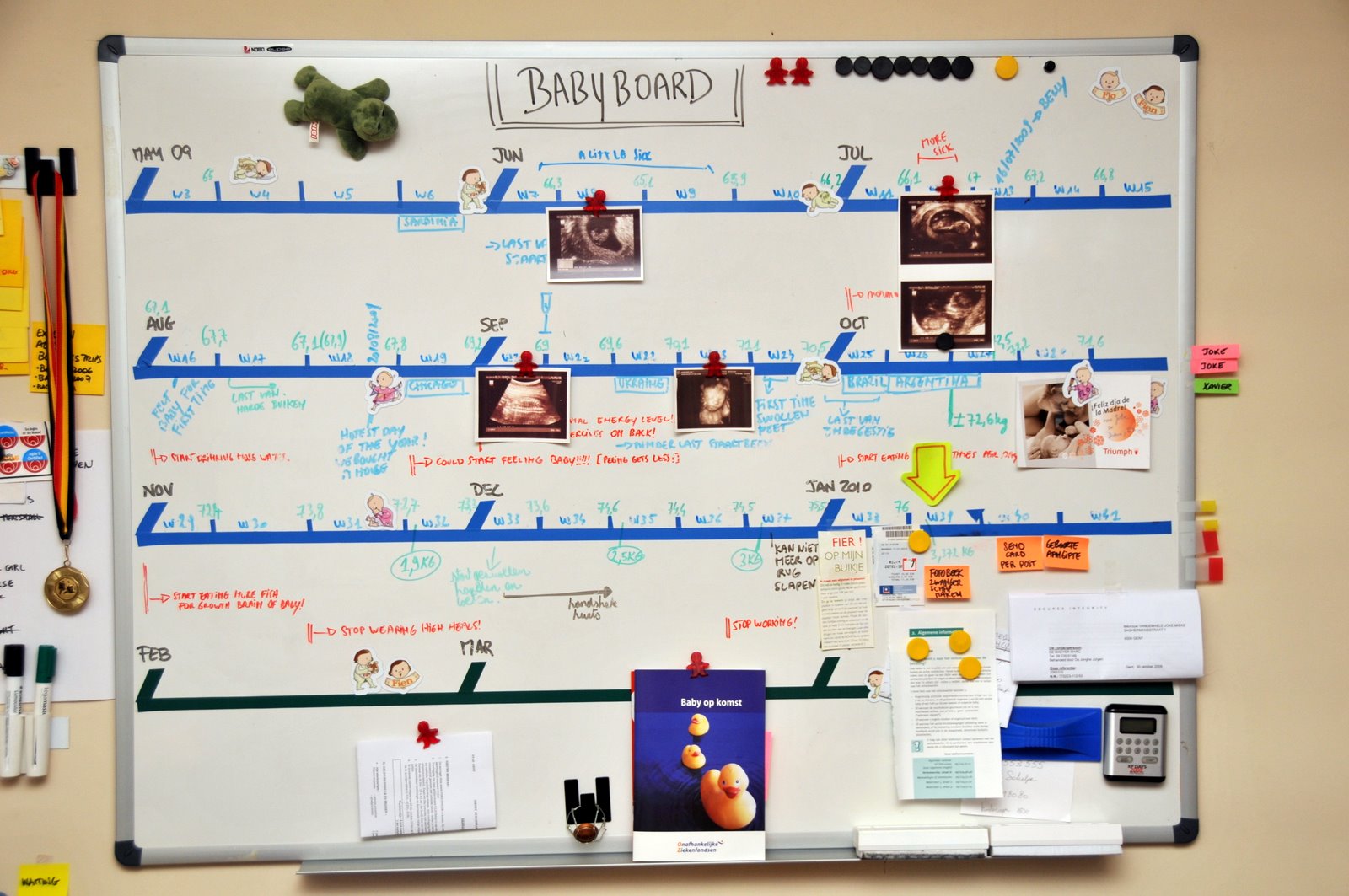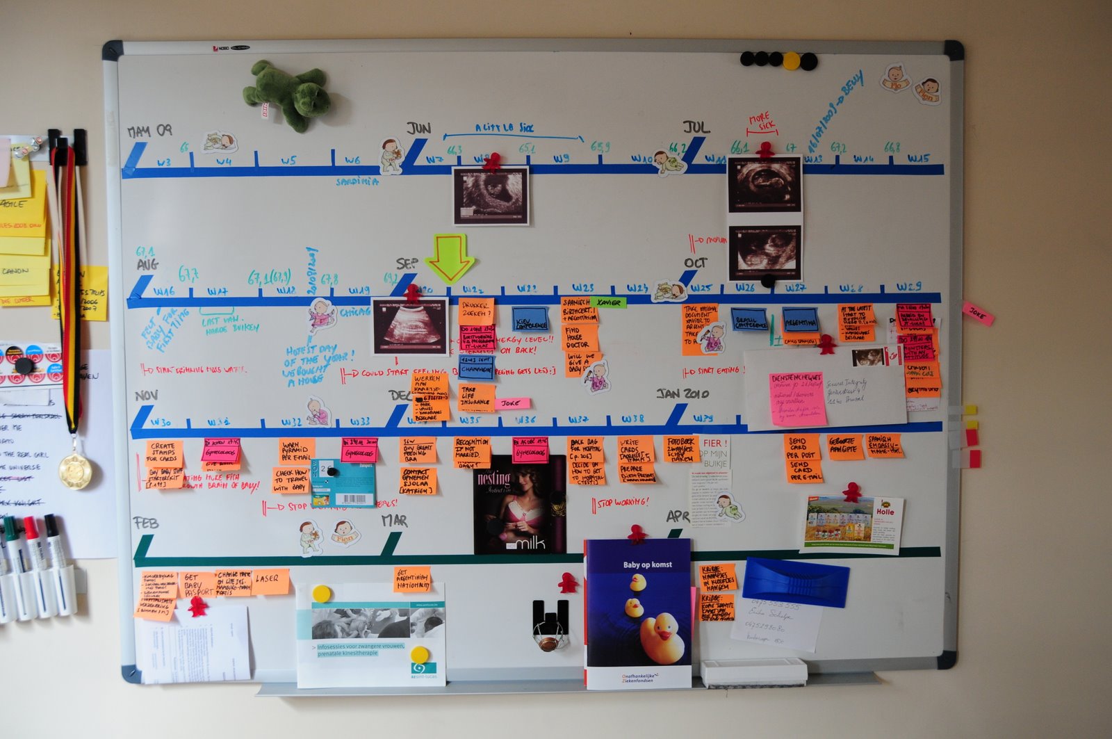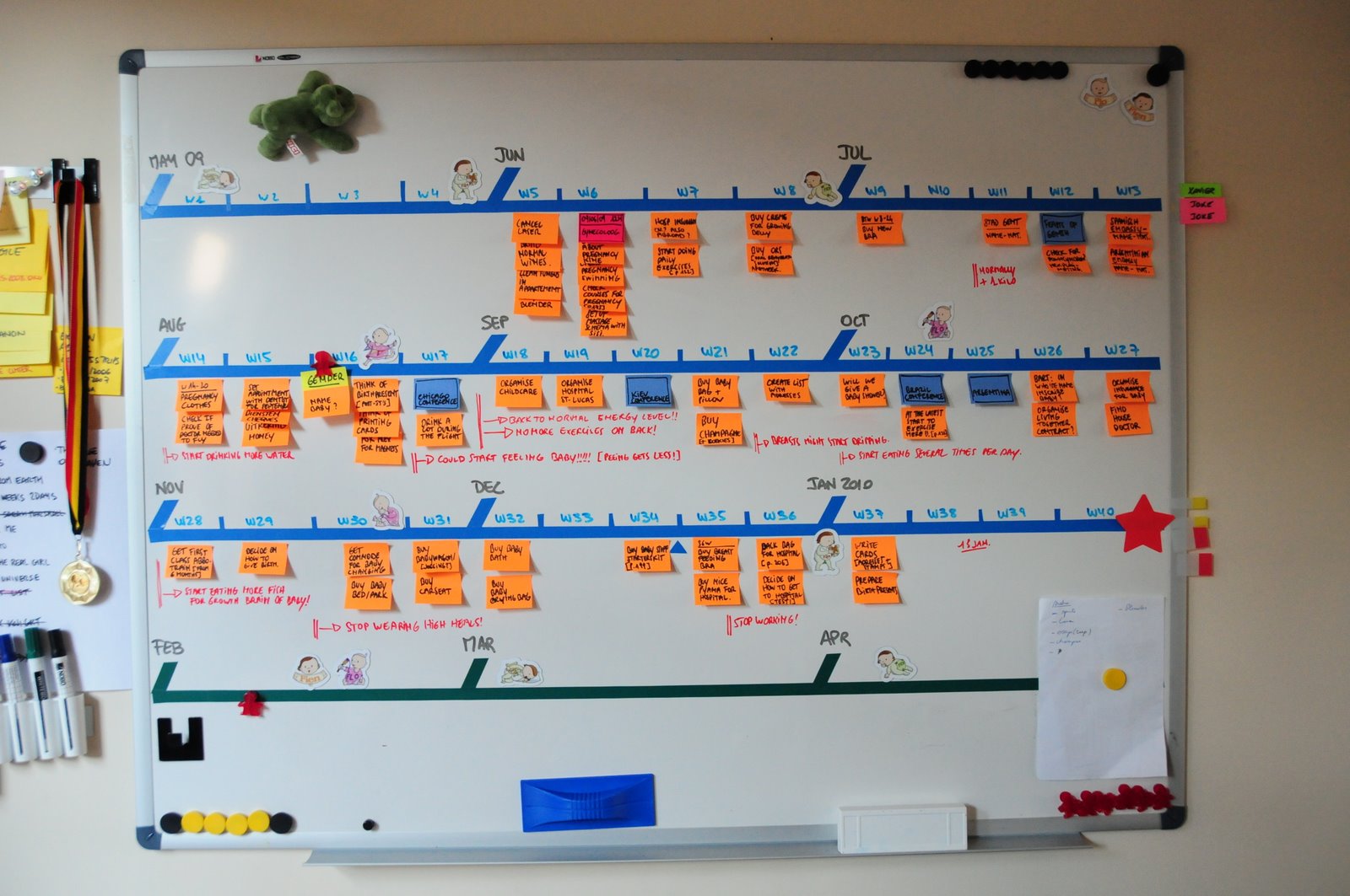 This is how the board looked when we got started, in week 5 (June 2009). The board was populated with all tasks and information we had at the moment: our initial planning. We adorned the board with some cute baby-themed magnets we got from cousin Flo. Tufte would not like them, they were pure decoration.