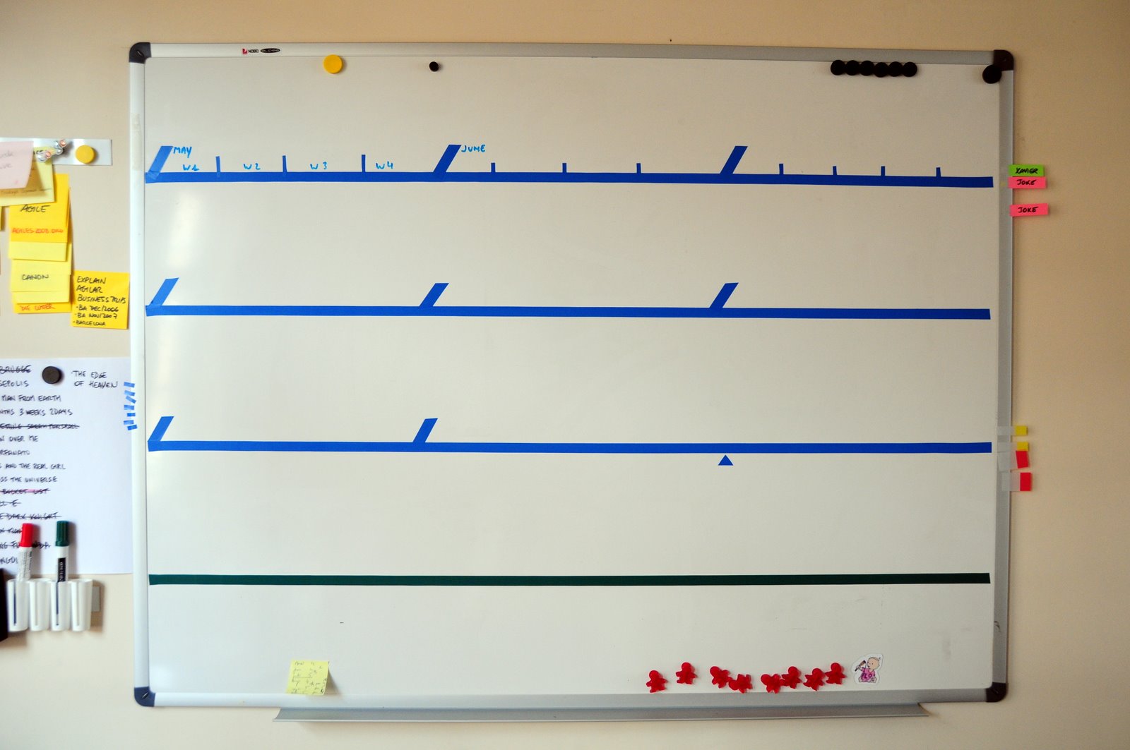 You can see that as the green arrow moves along, the post-its disappear with it. The fact that post-its were not accumulating further down the line meant we were proceeding at a good pace. If we would notice a cluster of orange tasks accumulating, we would know we were behind schedule and would react by putting in more time, or dropping requirements.